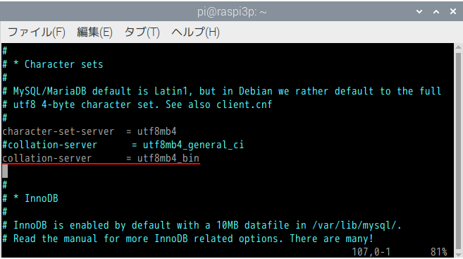 本記事では、collation-serverの設定値を(utf8mb4_bin)に変更しました。